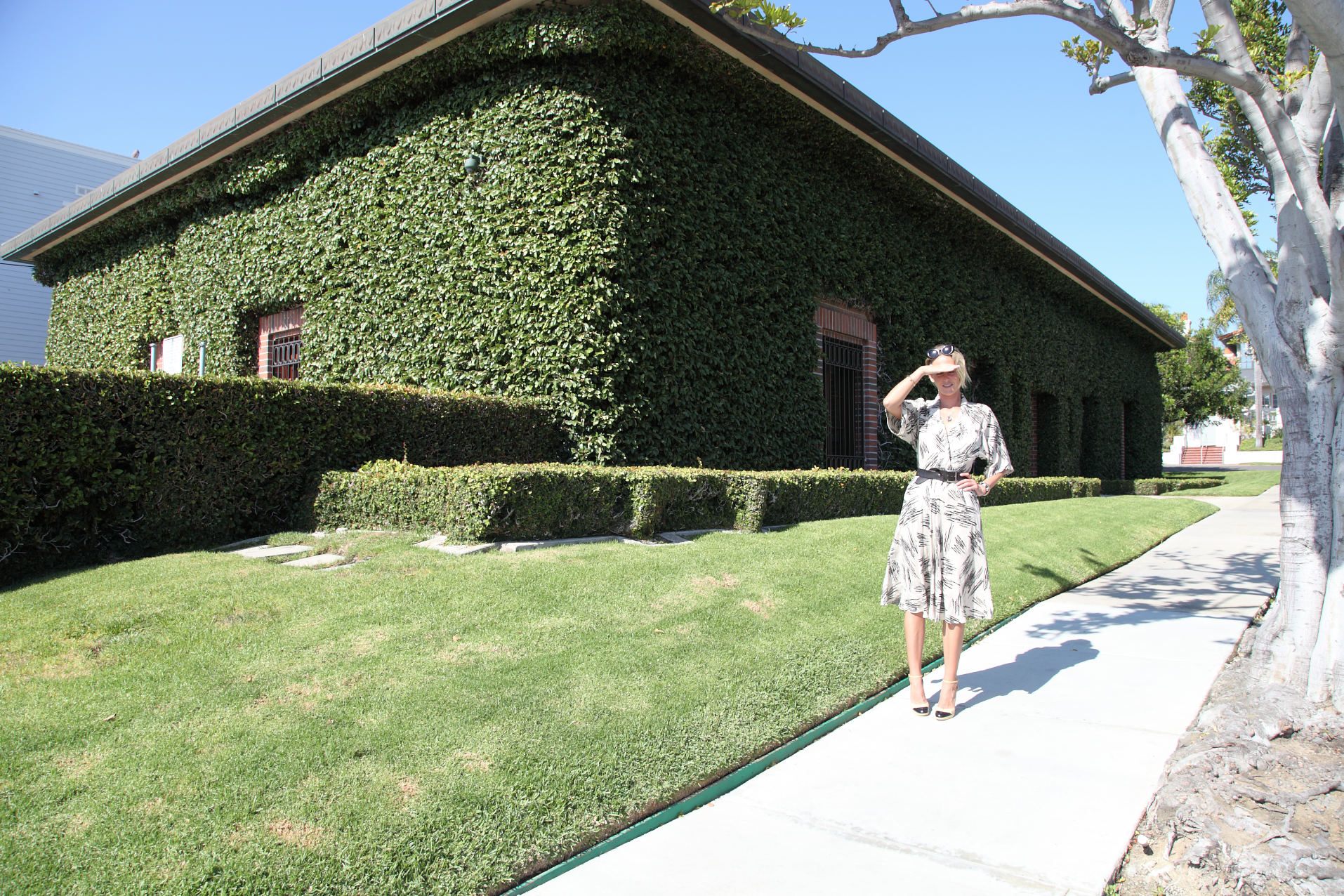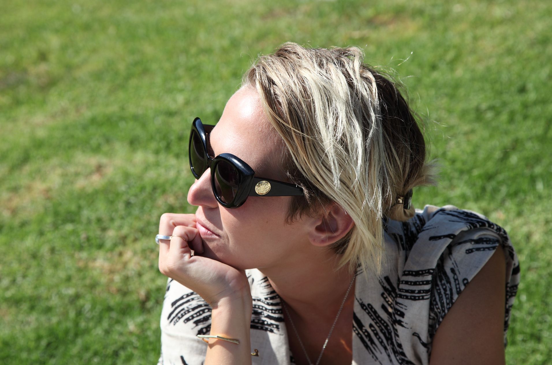 Taking another look into my archives, I pulled out this fab linen 80's dress I found at the NYC Lower East Side best kept vintage store secret, Edith Machinist. I love the silhouette because it has a slightly 40's vibe with 80's style bat wing short sleeves. And I adore the black on beige scratchy print. As per usual, I always style this dress with a bulky leather mens belt and some sexy heels, the ones here are Chloe. I also love pulling up my sleeves and rolling them a bit onto my shoulders. The low bat wings create a sexy side skin moment when you roll the sleeves up. And I am rocking my Diamond Brunch CRAP sunnies. I love them because they kind of make me look like a 60's cat cartoon.